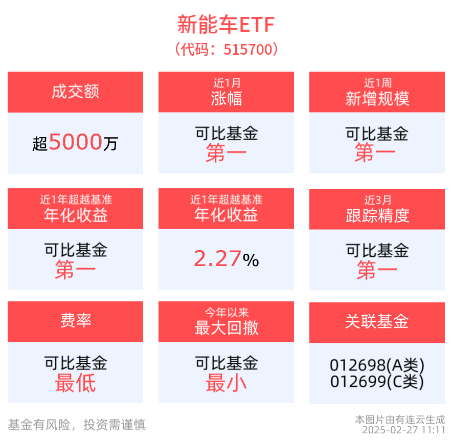 截至2025年2月27日 11:11,中證新能源汽車産業指數(930997)上漲0.54%,成分股瑞泰新材(301238)上漲9.74%,孚能科技(688567)上漲8.20%,德方納米(300769)上漲6.09%,當升科技(300073)上漲5.01%,廈鎢新能(688778)上漲4.56%。新能車ETF(515700)一度逆市漲超1%,最新價報1.81元,盤中成交額已達5502.04萬元,暫居可比ETF1/2,換手率2.09%。