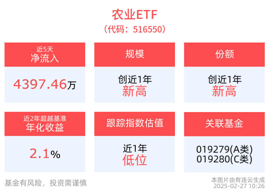 拉長時間看,截至2025年2月26日,農業ETF近半年累計上漲14.63%。規模方面,農業ETF最新規模達2.34億元,創近1年新高。份額方面,農業ETF最新份額達3.83億份,創近1年新高。