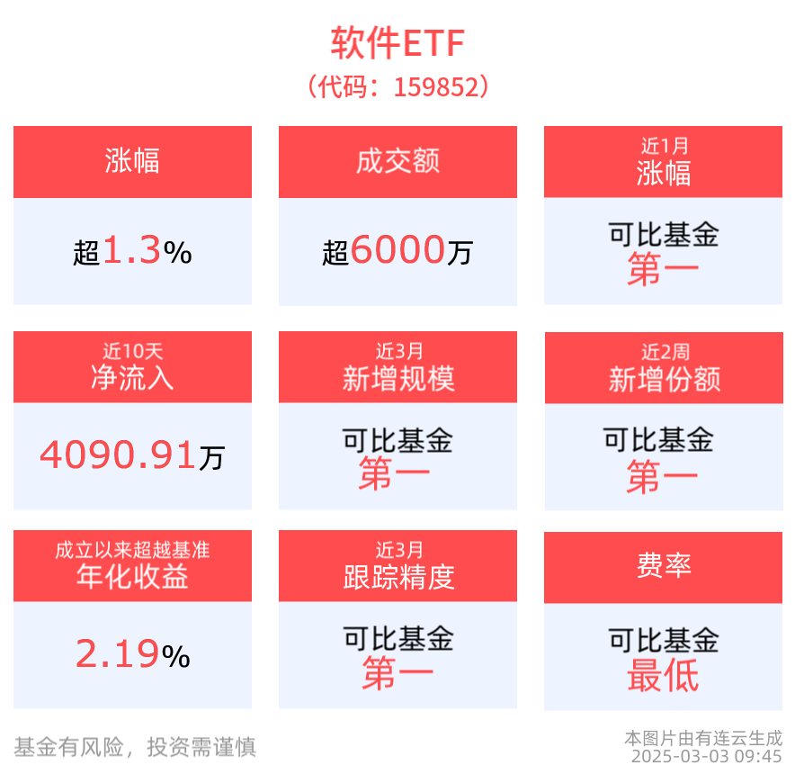 截至2025年3月3日 09:45,中證軟件服務指數強勢上漲1.15%,成分股用友網絡上漲8.39%,金山辦公上漲3.24%,航天信息上漲2.23%,千方科技、啓明星辰等個股跟漲。軟件ETF(159852)上漲1.36%,盤中成交額已達6510.39萬元。