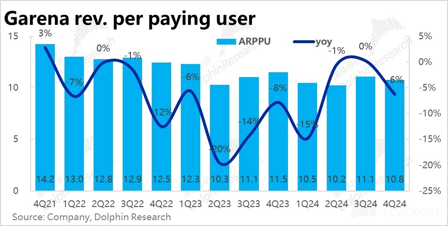 不過市場對流水的預期不算高,預期同比增速為 18%,環比減速整整 6pct。因此實際增長 19% 的表現,還是好於預期的。同樣從價量的口徑,本季付費用戶數是環比持平的,但人均付費金額卻由上季的同比持平,惡化到了本季同比-6%,是流水增長放緩的主要原因。因此整體來看,公司遊戲業務的生態有再度走弱的迹象。