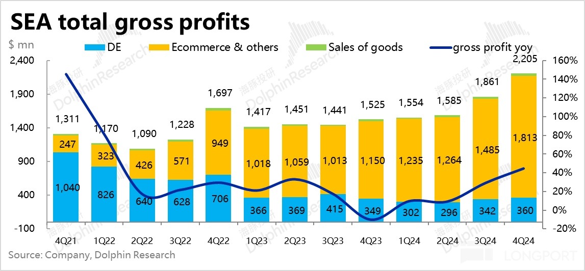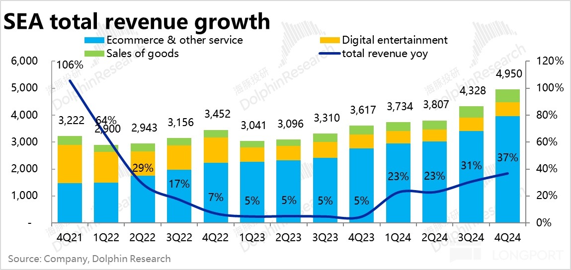 由於電商板塊超預期強勁的增長,以及金融和遊戲板塊的雖然底層經營指標表現不算太好,但營收角度也是好於預期的,本季 Sea 整體實現收入 49.5 億,同比增長 37%,增速再度環比走高 6pct,增長可謂相當強勁,但實際含金量沒有看似的那麼高。