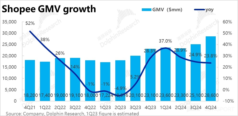 1、最關鍵的 Shopee 電商板塊上,本季GMV 達 286 億,同比增長近 24%,明顯好於市場預期 18% 的同比增速。趨勢上,環比上季增速僅降速約 1pct,盡管已邁入高基數期,電商業務的增長韌性顯著強於預期。