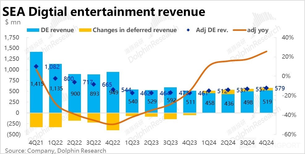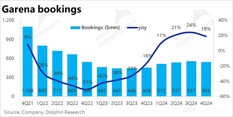由於遞延收入餘額變動的影響,Garena 的 GAAP 口徑下的收入本季同比增長了 1%,較上季-16% 的表現明顯改善,也好於市場預期的同比-1%。但受到調整項影響的財務指標,和底層經營數據展現出趨勢相反的情況下,顯然後者更加重要。因此,本季度遊戲業務的增長整體還是偏向負面的。