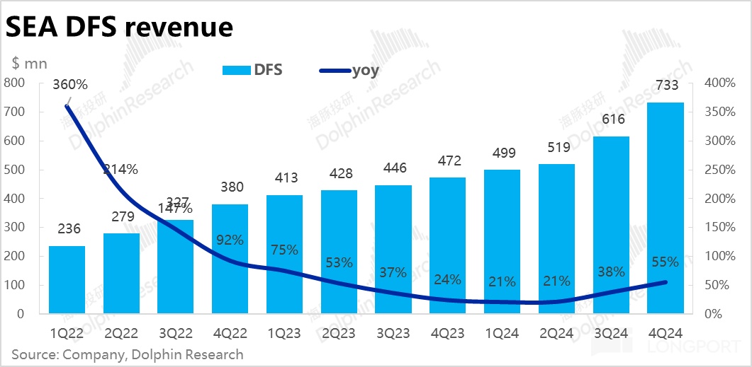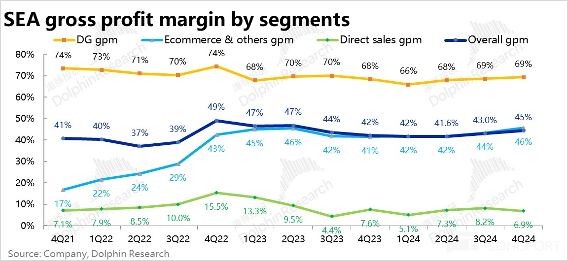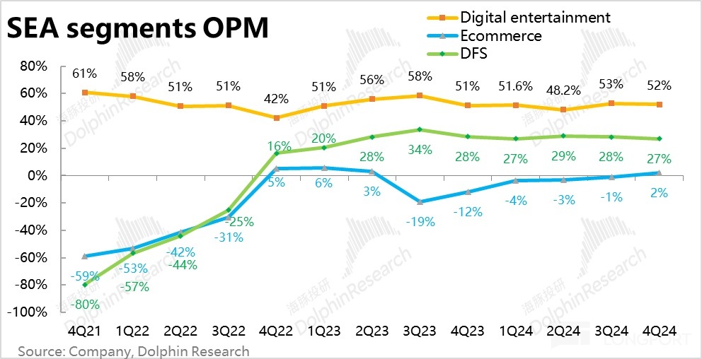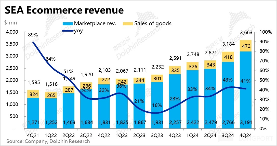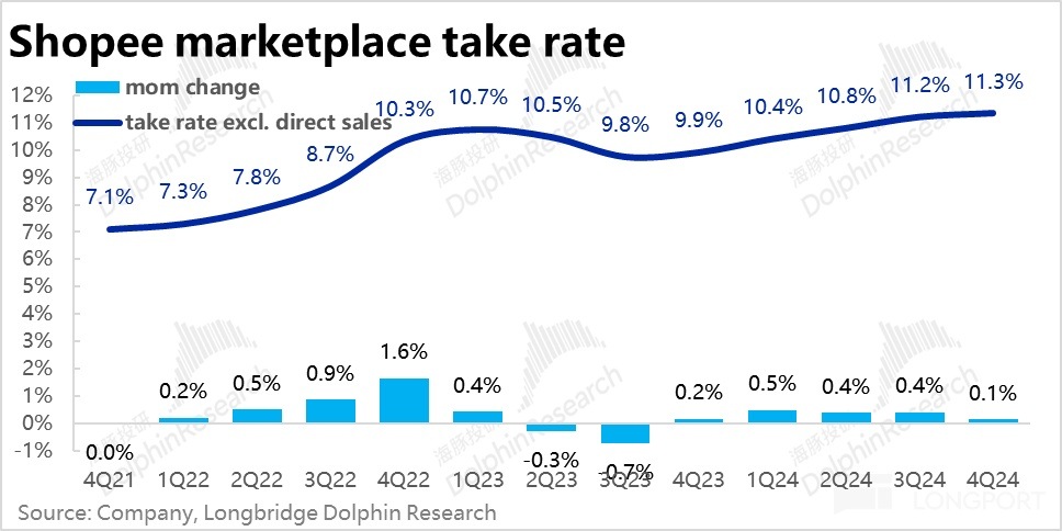 不過據海豚投研測算,Shopee平台業務的變現率本季環比的提升幅度僅為 0.1pct,是自 4Q23 變現率重啓上升趨勢以來,單季提升幅度最小的一次。不過具體看,高利潤的 marketplace 服務的變現率依舊環比走高了 0.4pct,是 VAS(如配送費)等利潤空間較低的收費項走低了 0.3pct,拖累了整體變現率的提升幅度,但由於高利潤的 marketplace 變現仍是顯著走高的,對電商板塊利潤率的提升的拖累會更小。