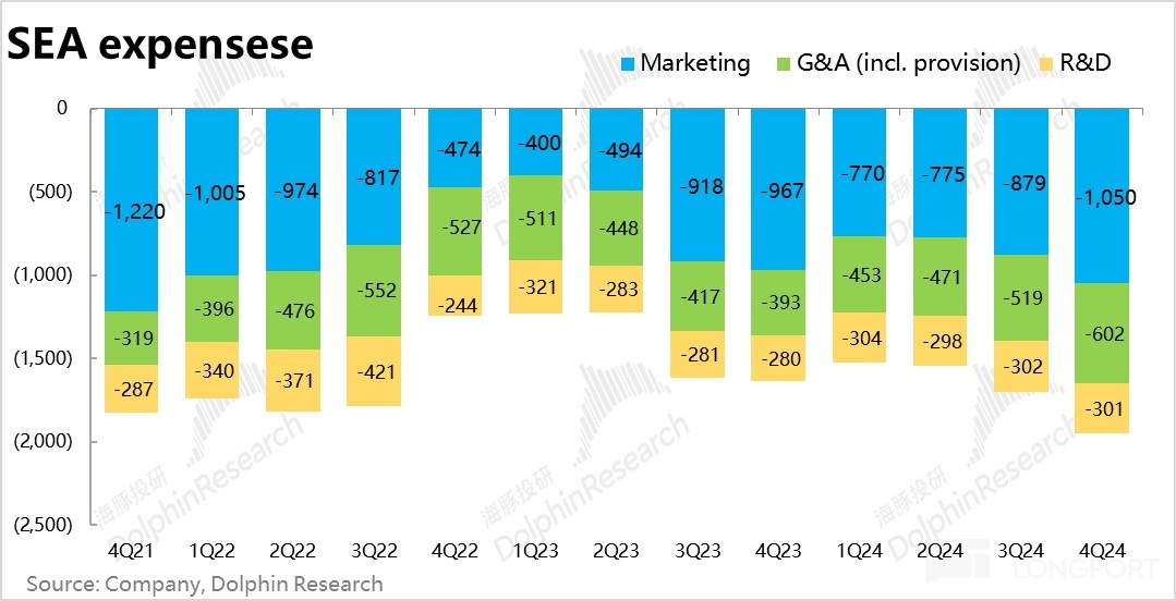 具體來看,主要是營銷費用的增長,佔收入的比重環比提升了約 0.9% 到 21.2%。分板塊來看Shopee 電商業務的營銷費用率反而是環比下降 0.7pct 到 23.3%。但是遊戲營銷費率則同比增長了 48%,增長相對明顯,但由於絕對值不過$0.45 億,影響不算大。其中金融板塊的營銷費用從上季的$0.66 億,近乎翻倍到了$1.2 億,可見營銷費用增長相對明顯。