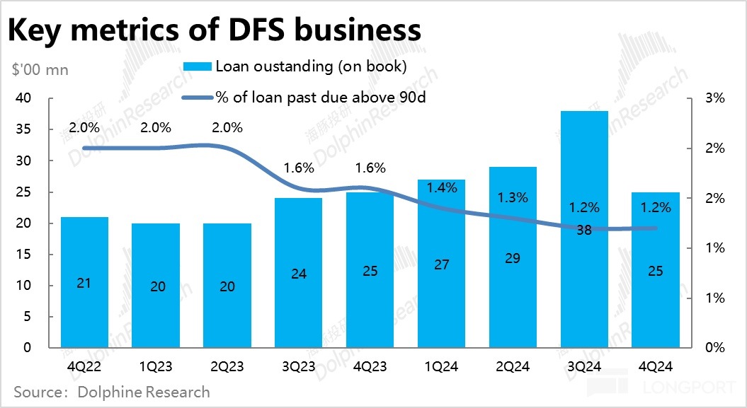 2、未來之星的DFS 金融板塊,本季核心指標--未收回的貸款餘額到達$51 億,同比增長 64%,但相比預期的 54.4 億(+75% yoy)實際是偏低的。