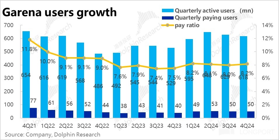 遊戲板塊的關鍵經營指標上,本季活躍用戶約 6.2 億人,付費用戶數 5000 萬人,前者環比減少了約 1100 萬人。兩項指標分別低於市場預期 3% 和 2%,且活躍用戶再度開始流失,顯然不是一個好信號。