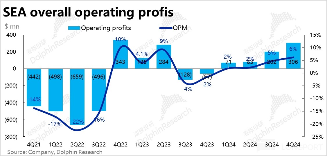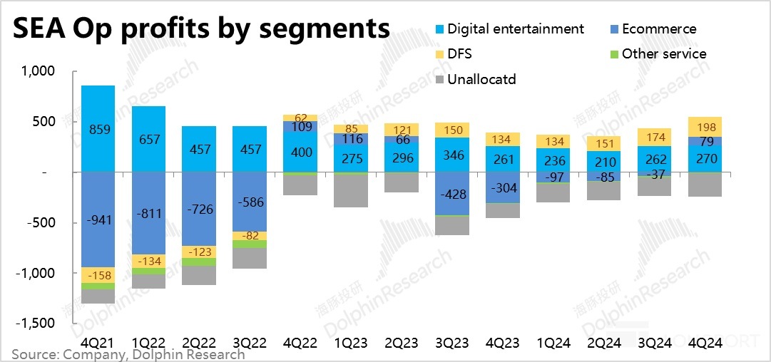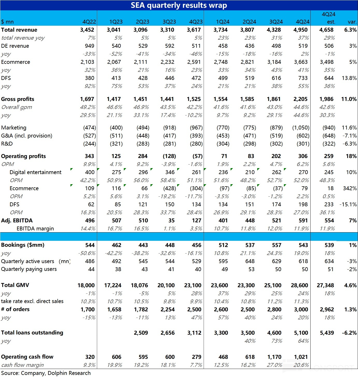 北京時間 3 月 4 日晚美股盤前,東南亞小騰訊$Sea(SE.US) 公佈了 2024 年 4 季度財報,整體來看電商板塊的增長和利潤改善都好於預期,是最大亮點。但遊戲和金融板塊的底層經營指標實際有一些隱患,核心要點如下: