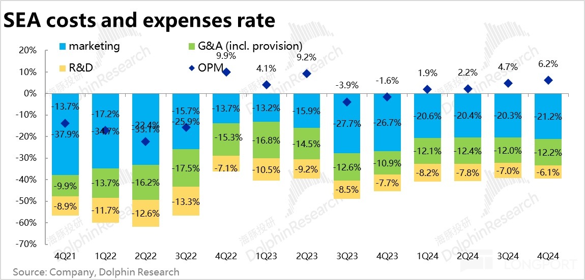 雖然總體經營費率是環比小幅增長了 0.2pct,但由於變現率的走高,毛利率環比提升整整 2pct。因此本季 Sea 整體的經營利潤率仍是提升到了 6.2%(vs.上季的 4.7%),實際經營利潤約$3.1 億,比預期的$2.6 億高出約 18%,利潤釋放速度還是好於預期的。