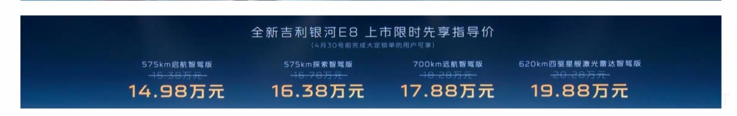 銀河 E8 售價 14.98-19.88 萬元,相比指導價下調 3200 元