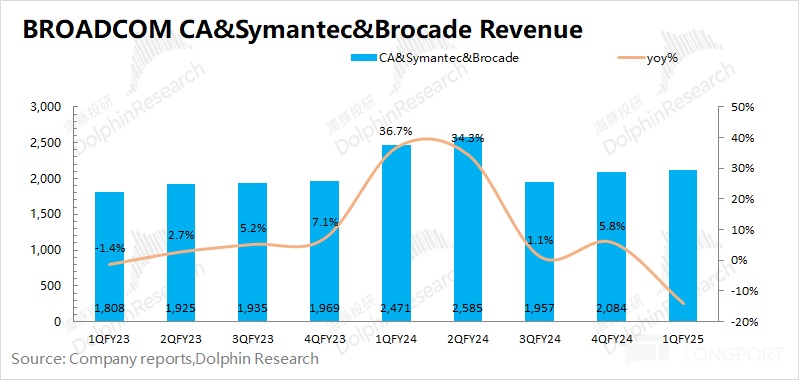 結合公司財報及相關信息,海豚君認為公司原有的軟件業務(CA&Symantec&Brocade)相對穩定,保持在 21 億美元左右位置,在收入中佔比大約在 14% 左右。