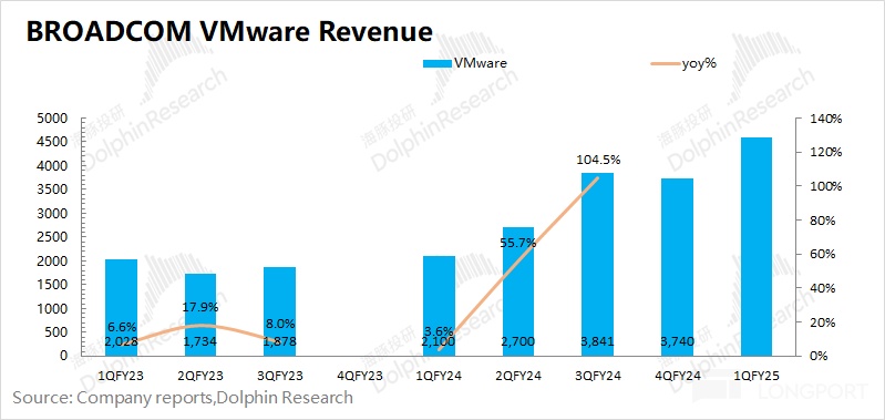 博通 BROADCOM (AVGO.O) 在 2025 財年第一季度的基礎設施軟件實現營收 67 億美元,同比增長 46.7%。在上一財年中,公司軟件業務的快速提升,主要得益於 VMware 的並表。而從本季度開始,軟件業務的增長,主要來自於 VMware 的内部整合提升。