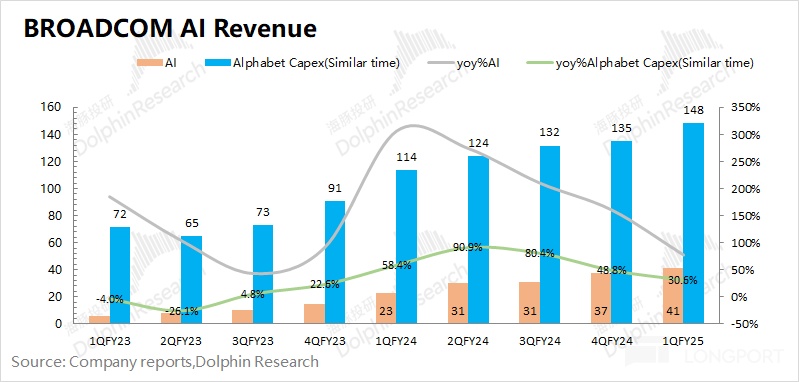 由於兩家公司的財報時間口徑不同,海豚君將其近似於一個口徑内,可以看出兩項有明顯的相關性。當谷歌大幅提升資本開支的情況下,公司的 AI 收入也迎來了較快的增長。由於谷歌對 2025 年的資本開支預期達到 750 億美元,同比增速達到 40%+,公司的 AI 收入也將繼續受益。