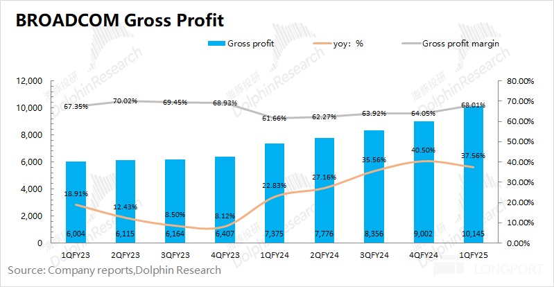 博通 BROADCOM (AVGO.O) 在 2025 財年第一季度實現毛利 101.45 億美元,同比增長 37.6%。其中博通在本季度的毛利率為 68%,同比環比均有提升。