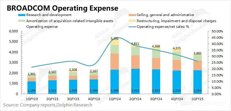 博通 BROADCOM (AVGO.O) 在 2025 財年第一季度的經營費用為 38.85 億美元,同比下滑 26.6%。在公司持續控費和内部整合的情況下,公司經營費用受收購攤銷等影響逐漸減弱。