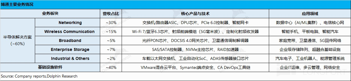 而在兩大類業務中具體包括,1)半導體解決方案:網絡、無綫、存儲連接、寬帶、工業及其他;2)基礎設施軟件:VMware、CA、Symantec、Brocade 等。