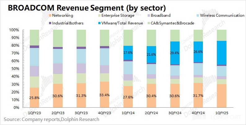 根據公司財報,由於公司本季度軟件業務的增長主要由 VMware 貢獻,海豚君預估公司本季度 VMware 的收入大約為 45 億美元左右,在整體收入佔比在 3 成左右。博通在收購 VMware 後,對業務進行了剝離調整,當時剝離出售了終端用戶計算等非核心業務。