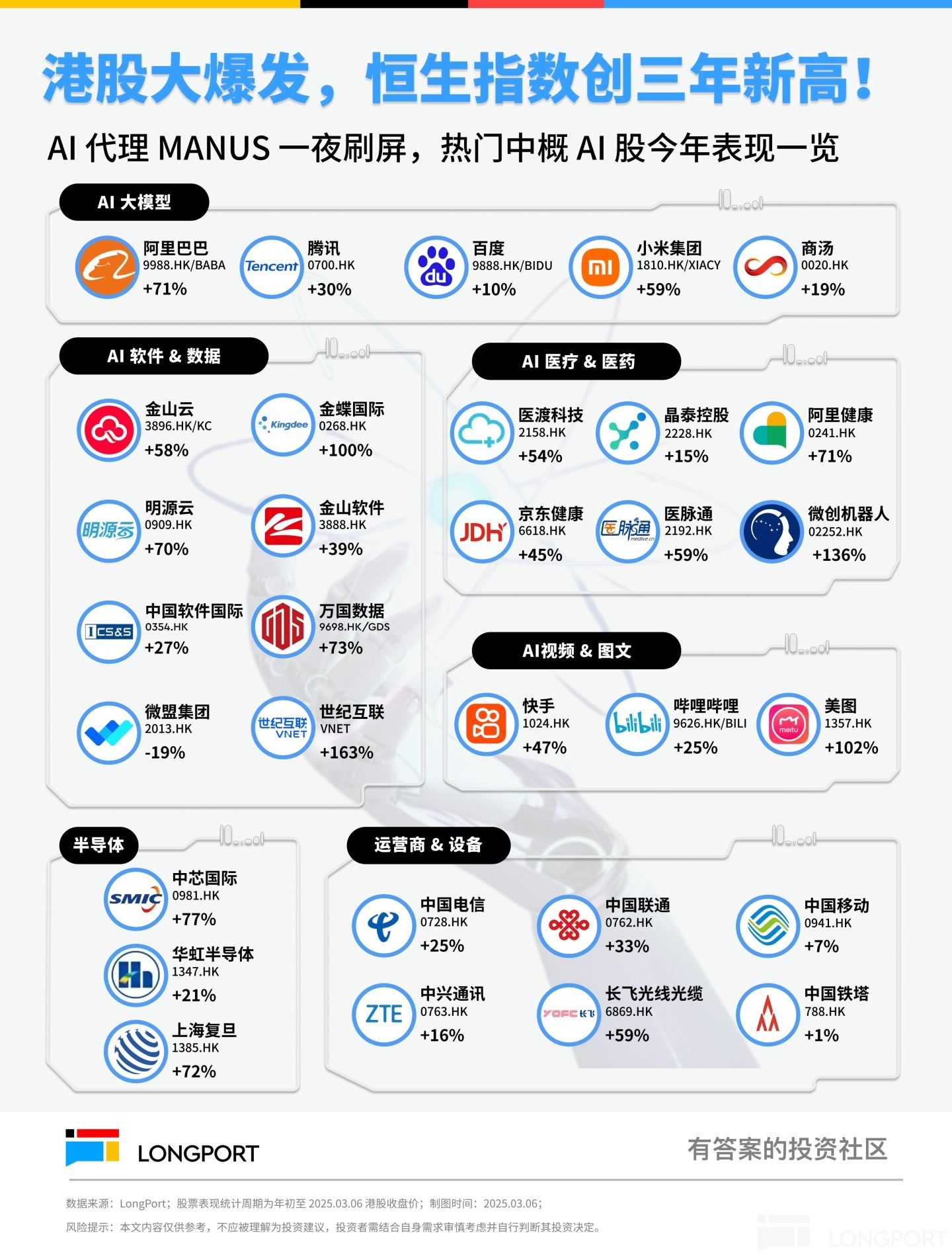 昨日阿裡推出全新推理模型,AI 代理 Manus 一夜刷屏,一圖了解熱門中概 AI 股: