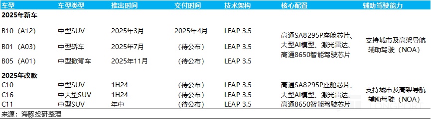 四季度公司同時在研發 LEAP 3.5 架構,在 2025 年 3 約首發,繼續提升了整體的域控的集中度以及整車的性能與能力,首次搭載了高通 8650 智駕芯片(從原先的 Orin X 切換到高通芯片),配備了激光雷達等智駕硬件,1 個超級大腦可以支持端到端高階智駕,統籌座艙、動力、車身域功能融合協同。