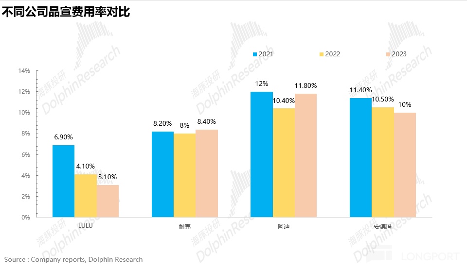 從下圖可以看到,LULU 的品牌宣傳性費用率明顯低於同行: