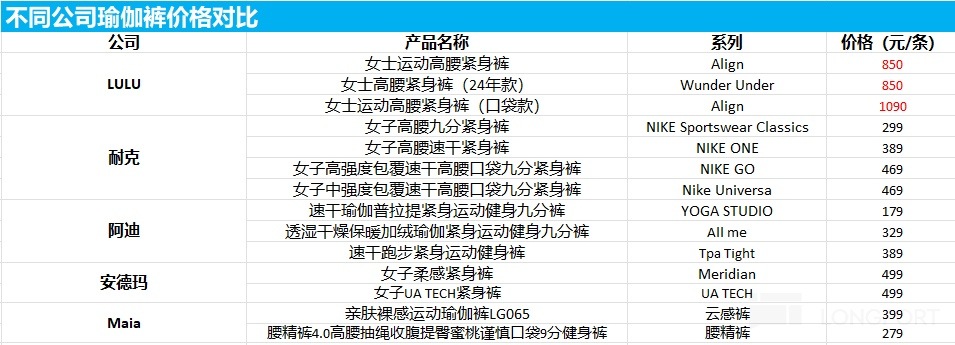 之所以把 LULU 和愛馬仕劃等號,說白了就是一個字——貴。大家可以從下圖感受一下,同樣是瑜伽褲,LULU 的定價是阿迪耐克的 2-3 倍,更不用說眾多品牌調性不如阿迪耐克的公司。