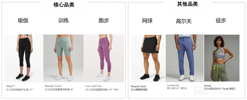 在 「小黑褲」 大獲成功的基礎上,近年來 LULU 積極向其他品類橫向拓展。目前,LULU 將瑜伽、跑步、訓練確定為核心品類,同時也進軍網球、高爾夫、徒步等多個運動場景 「搶佔」 消費者更多的衣櫃空間。