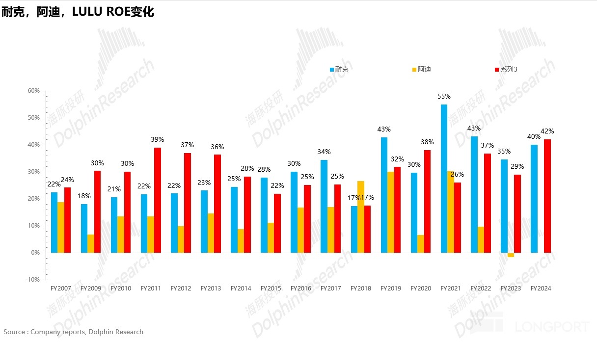 從投資回報率上看,這家公司的 ROE 也是常年維持在 15% 以上,算得上標準的 「巴菲特式好公司」,它就是 Lululemon(中文露露樂蒙,後文簡稱 LULU)。