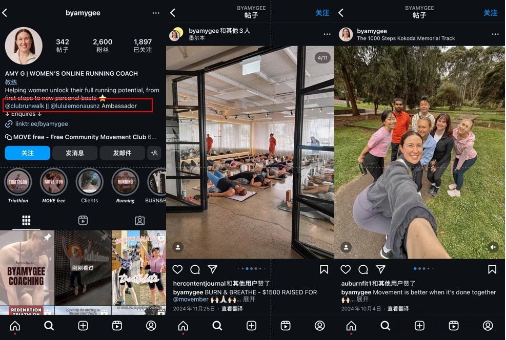 品牌大使——KOL:不同於多數運動鞋服品牌的品牌大使多以知名球星、運動員為主,LULU 的品牌大使則非常接地氣,多以社區的瑜伽館、健身房、普拉提等工作室的教練為主,在各自的領域算的上中等水平的 KOL,自帶一定的流量。