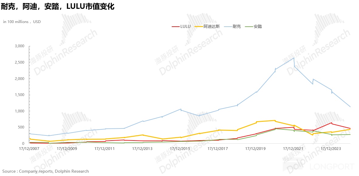 但與此同時,一家同處於運動鞋服賽道的公司,自疫情以來營收和淨利潤均以 25% 的 CAGR 逆勢高增,似乎並沒受到太多宏觀層面的影響,市值也是一路高歌猛進並於 23 年超過阿迪成為僅次於耐克的全球第二大運動鞋服上市公司。