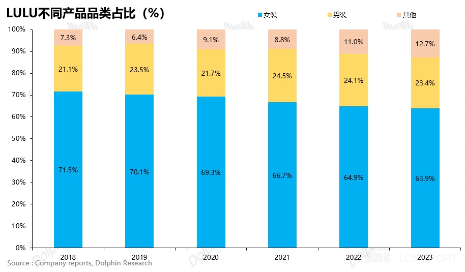 根據下圖,可以看到服裝佔到了 LULU 銷售額的 90% 以上,其中女裝又佔到了服裝的 70% 以上,是 LULU 的核心品類。