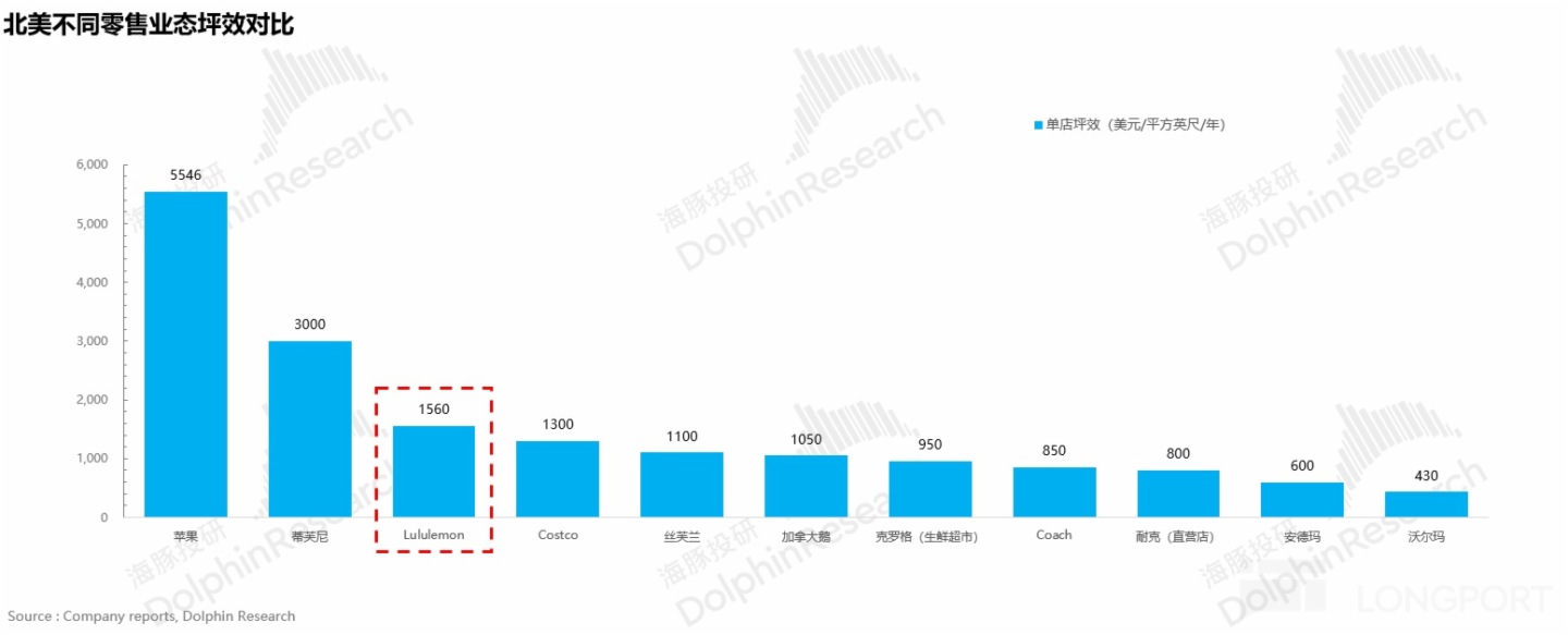 b. 從單店坪效角度看,LULU 在北美服裝行業擁有最高的坪效,是耐克、安德瑪的兩倍以上,在所有綫下零售業態的門店中也僅次於蘋果和蒂芙尼(珠寶品牌)。