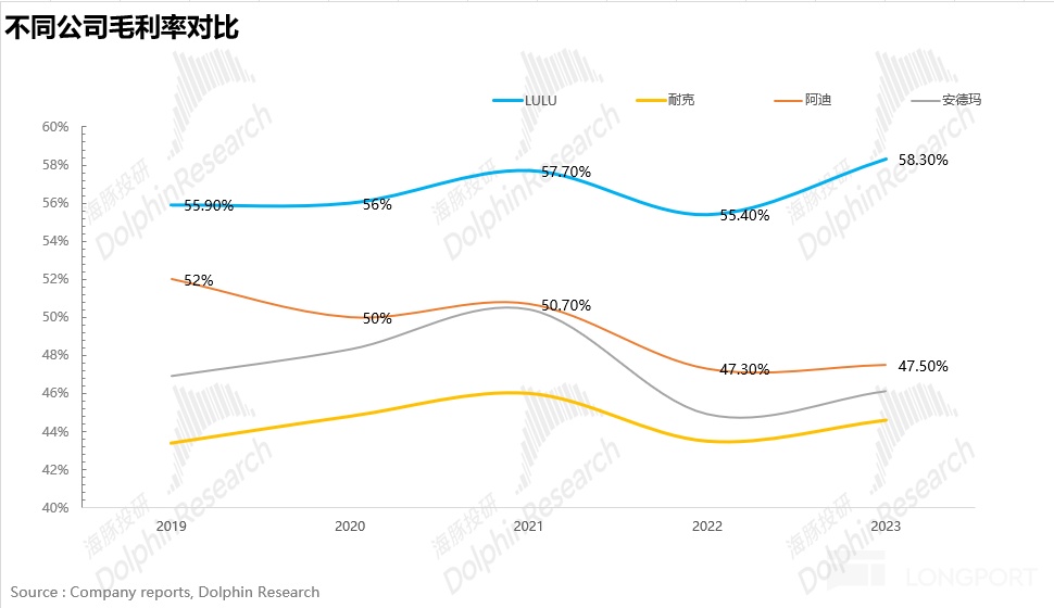 超高的定價也使得 LULU 的毛利率遙遙領先,接近 60% 的毛利率超出同行 10 個點以上,但問題是為何如此高的定價仍然不影響 LULU 的銷量一路狂飙?