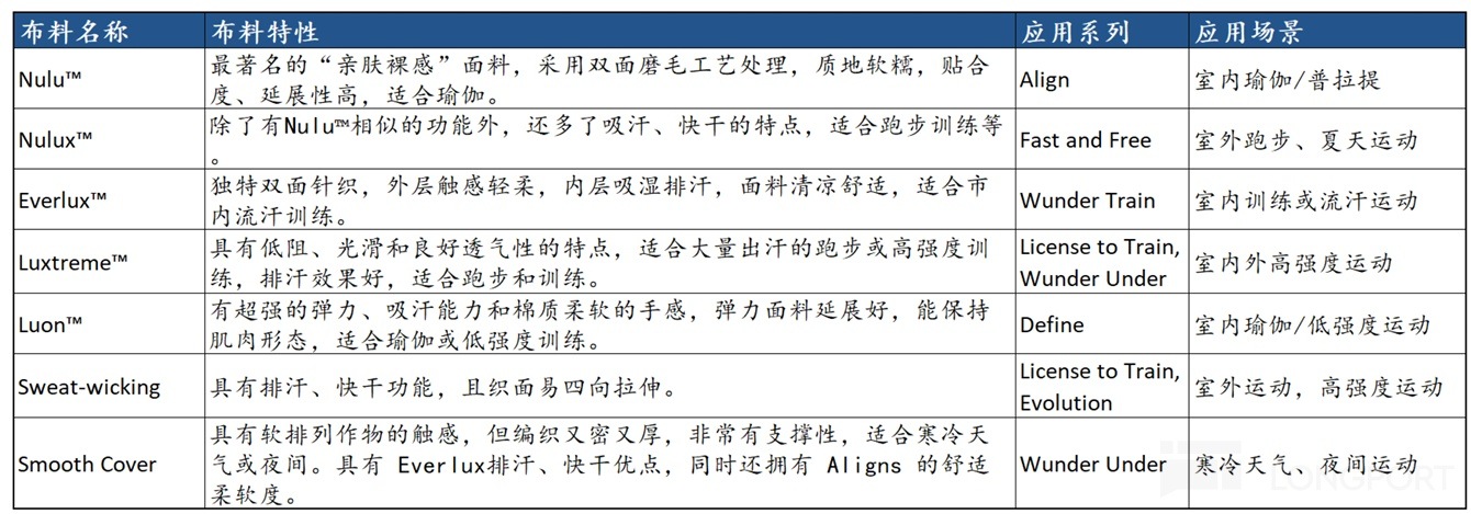 多年的積累使得 LULU 當前擁有 9 種核心面料,每種面料根據自身性能的不同可以被用在不同的運動場景,且 LULU 把每種核心面料技術&生産工藝均申請了專利(包括面料成分組合、紡織方法、功能性處理技術等)