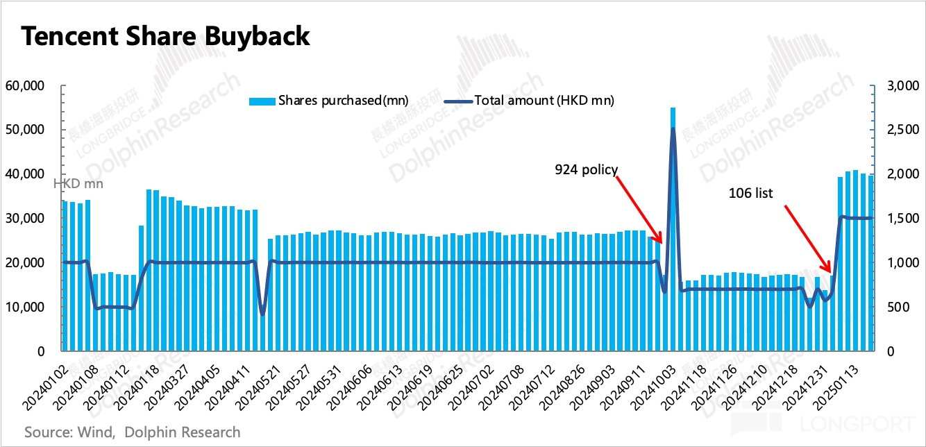 但 1 月初,騰訊上了美國國防部制裁名單後,公司馬上開啓爆買模式,連續五個交易日每日狂撈 15 億 HKD。