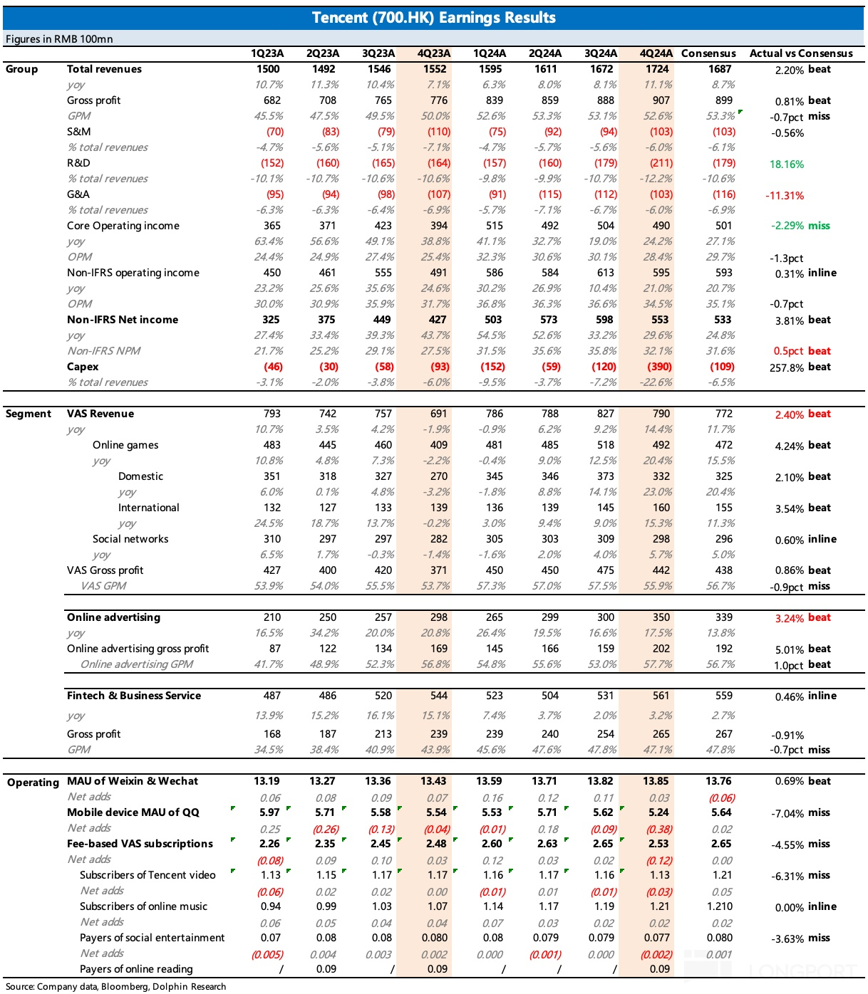(1)在高預期下,遊戲仍然小超預期。四季度騰訊其實能貢獻增量的新遊戲不多,兩款手遊表現平平,只有 9 月發的《三角洲行動》還不錯,尤其是 PC 端。