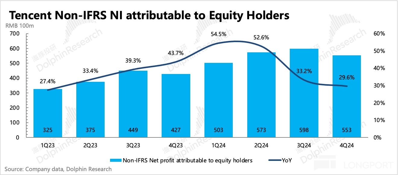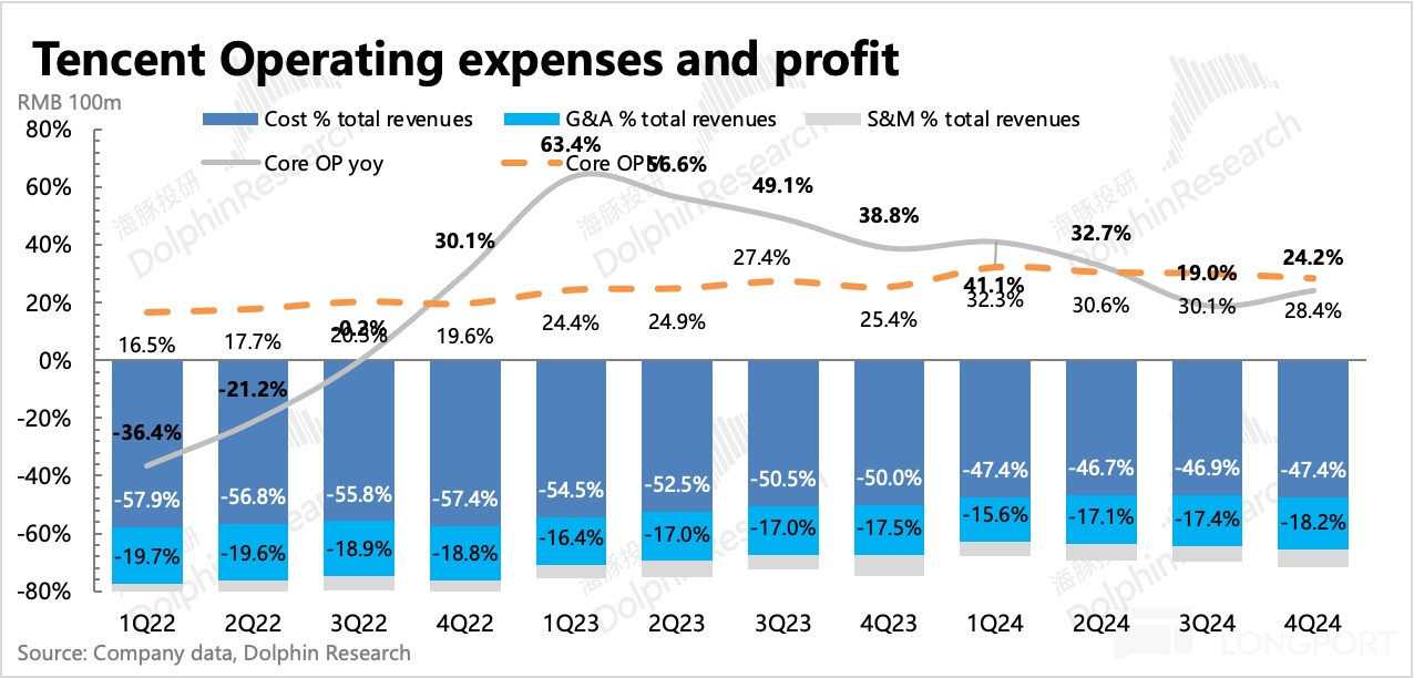 但海豚君也認為,四季度業績的驚喜之處在於,騰訊本身業務增長彈性仍然存在一些預期差,以及内部生態資源整合、復用下,研發費用之外的開支(成本、銷售、管理費用)進行有效控制,從而抵消 AI 投入對短期利潤的部分沖擊。