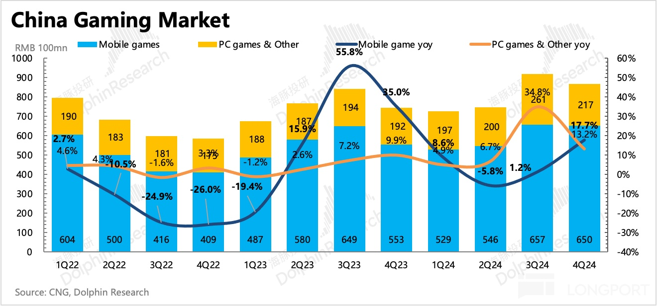 四季度網絡遊戲收入 492 億,同比增長 20%,除了 DNFM 的增量,新遊戲中還包括國内的《三角洲行動》、海外的《流亡黯道 2》的貢獻。此外,部分常青遊戲也通過運營調節,在去年低基數上實現了同比增長。