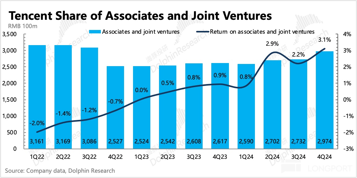截至四季度末,公司聯合/合營資産規模合計 2974 億,結合當期分佔盈利 92 億,計算得四季度騰訊的投資收益率為 3%,環比略有提升。從 2022 年至今,總體上呈現良性向好的趨勢。