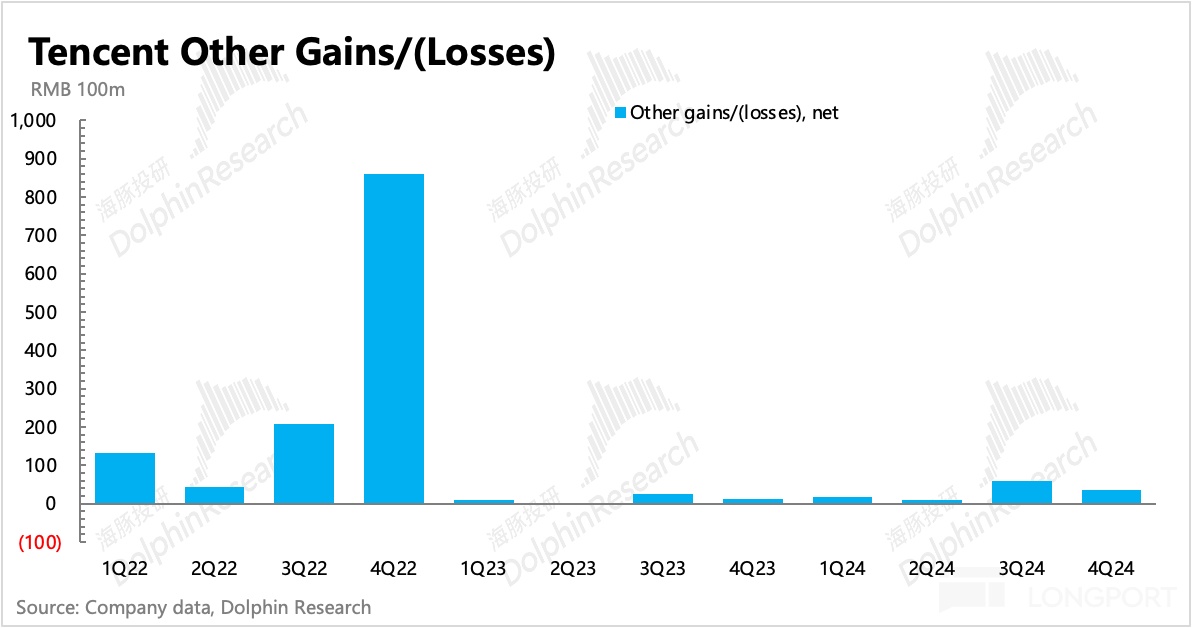 公允價值損益基本跟隨市場行情,但資産處置收益四季度實現 22 億,全年處置收益近 130 億,相比去年 40 億的規模,明顯是加快了。這與海豚君去年初的預期一致:回購壓力 + 對 AI 等新技術的不缺位投資,促使騰訊保持較高的資産處置意願。