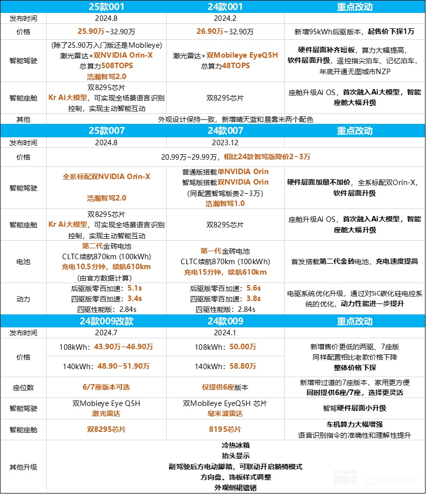 四季度,雖然 24 款 001/007/009 開始上市交付,並且是完整的交付季,雖然是極氪中期改款的産品,改款力度大,在電機功率,智駕硬件,及 800V 高壓平台快充上都做了升級,且相比 24 款繼續降價,但仍然受到了來自競品小米 SU7 的沖擊。