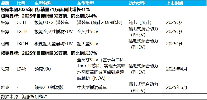 其中極氪品牌 2025 年全年銷量目標 32 萬輛,同比增長 44%,而今年極氪將會推出一款中型轎車和兩款大型插混 SUV,領克品牌 2025 年目標銷量 39 萬輛,同比增長 37%,由兩款插混新車支撐。