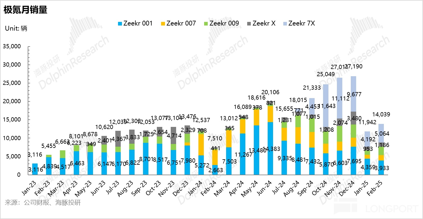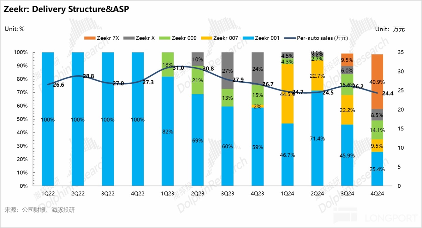 但新上市車型極氪 7X (純電 SUV) 扛起了沖銷量的重任,因為領先的三電優勢,以及較強的性價比,在車型結構中佔比環比提升了 31 個百分點至本季度 41%,帶動了四季度整體銷量環比回升 44% 至 22.2 萬輛,雖然仍低於極氪之前所制定的 2024 年 23 萬的銷量預期。