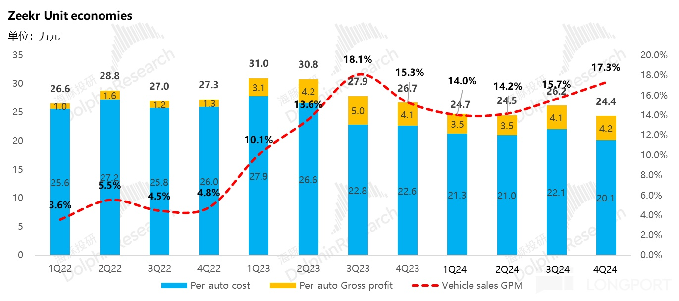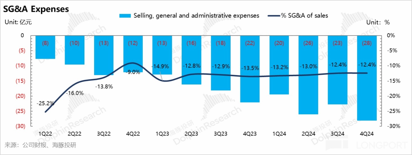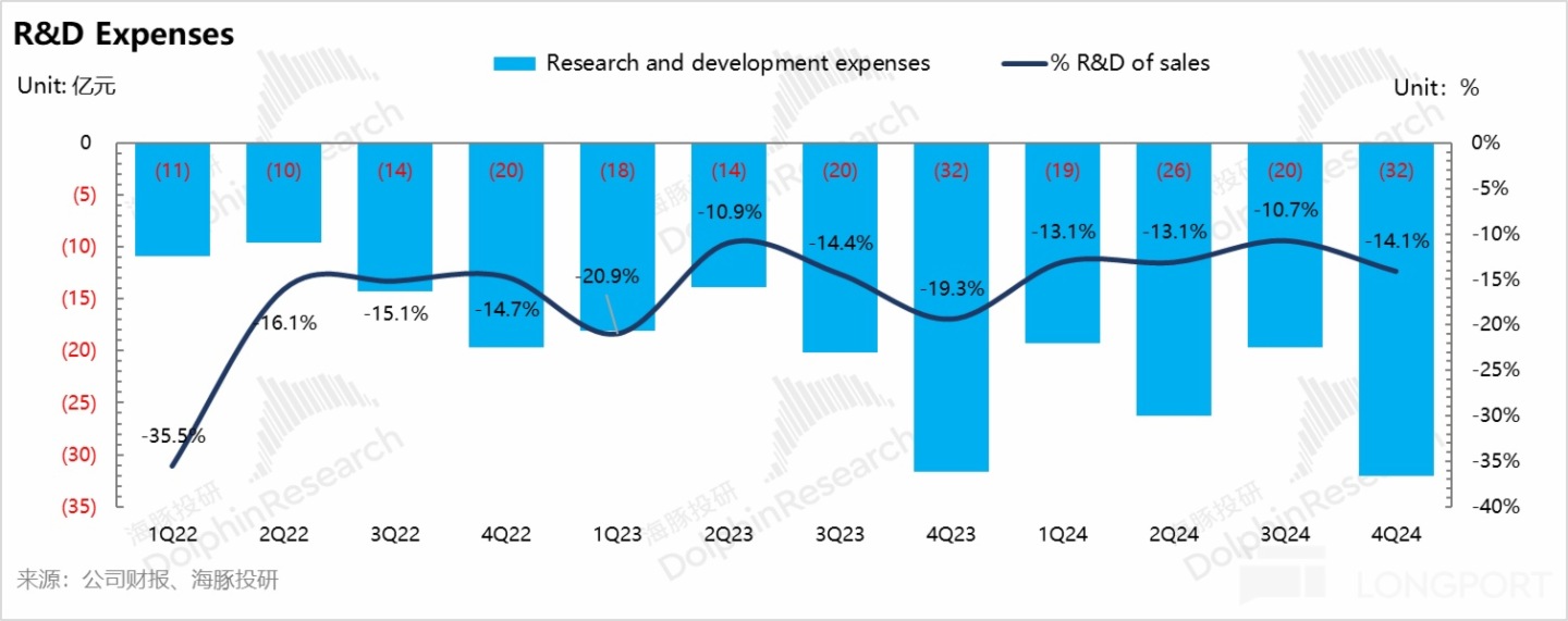 四季度極氪研發費用 32 億,相比上季度環比增長 12 億,研發投入也明顯超出 2024 年 80 億的指引,海豚君認為仍然極氪仍然在補智駕短板,以及投入 2025 款新車型的研發。