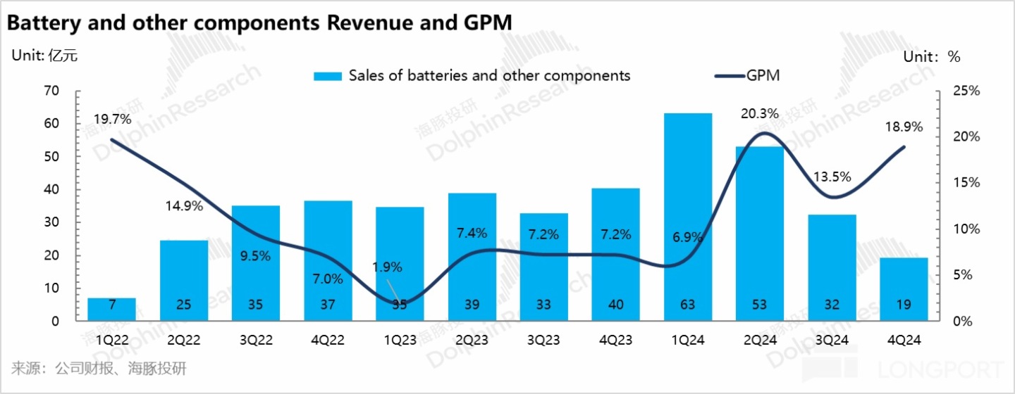 四季度電池及組件業務收入 32.5 億,環比上季度繼續下滑 13 億左右,主要由於電池包和電驅係統銷量及單價下降。