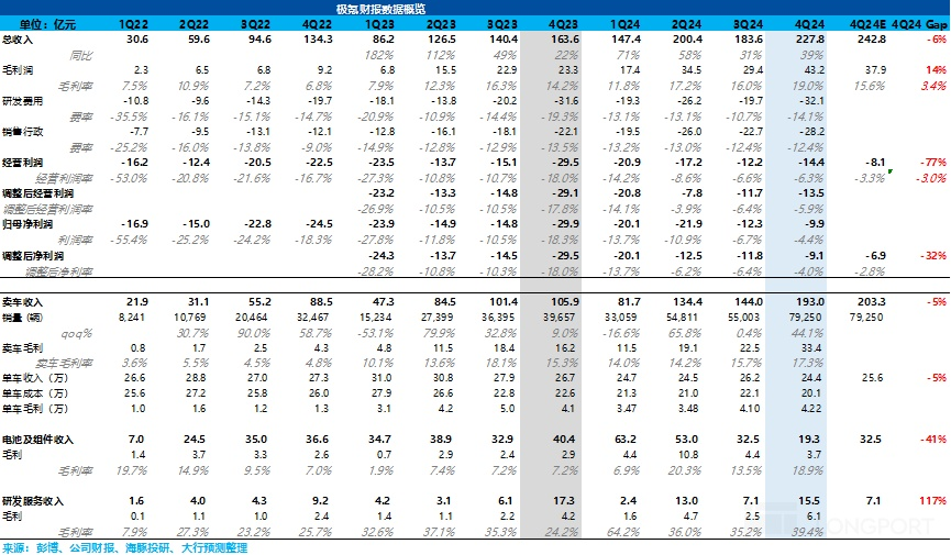1)整體收入端低於市場預期:四季度收入 227.8 億,低於市場預期 242.8 億,預期差有接近 15 億,但由於電池及組件業務環比上季度下滑了 13 億(由於銷售的電池包和電驅的銷量減少和單價下滑),雖然研發及服務業務環比上行 8 億(年底一係列研發項目驗收,確認高峰期),所以這兩項業務總收入最後環比下行 5 億,但由於這兩塊業主要自供為主(供給吉利體係下公司),所以在沒有看到外供起量前,市場也不會對這兩塊業務特別關注,所以核心仍然在汽車業務上。