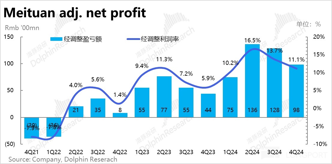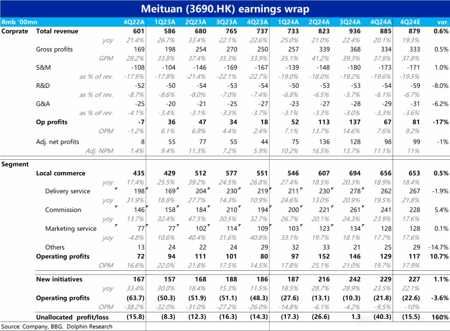 3 月 21 日港股盤後,$美團-W(03690.HK) 發佈了 2024 年 4 季度財報,各項指標基本相比一致預期都差異不大,屬於不錯的達標表現,具體來看: