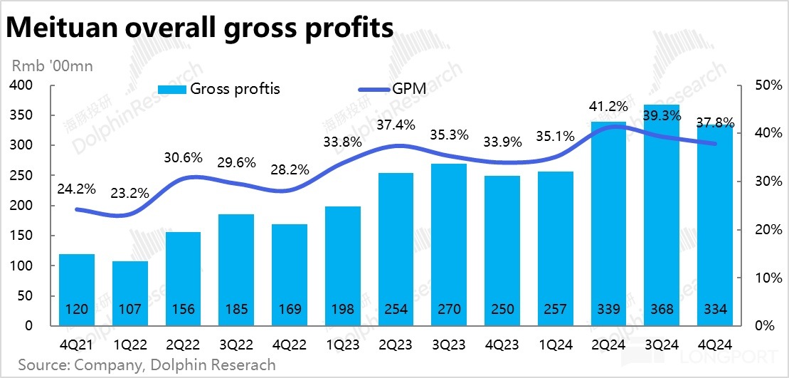 成本和費用角度,本季度美團毛利潤達 334 億元,毛利率為 37.8% 環比下降了 1.5pct。相比 2023 年 4Q 比 3Q 下降 1.4pct 的幅度基本一致,可見是正常的季節性變化所致。