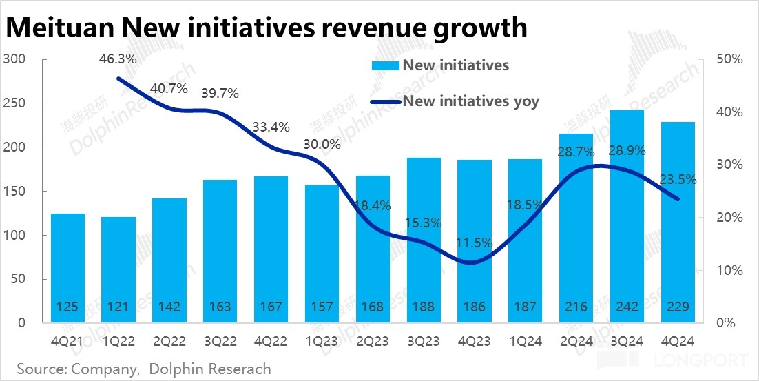 3、以美團優選和小象超市為核心,以及單車、海外業務等一眾的創新業務本季營收 229 億,同比增長 23.5%。雖然公司正拓展海外業務,創新業務整體的收入額和增速卻都是環比下降的。公司的解釋是因為 4Q 淡季導致的。但海豚投研認為,也不排除是投入重點傾向海外後,其他創新業務可能更偏向收縮,以保證整體的虧損額不會太過擴大。