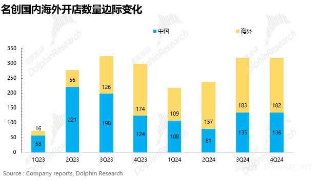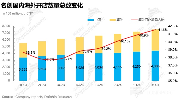 從開店數量上看,截至 24Q4,名創總店鋪數量新增 360 家達到 7780 家,其中海外和國内分別淨新增 182 和 178 家,海外門店佔比進一步環比提升至 41.6%。全年維度看,海外淨新增 631 家門店,開店速度創歷史新高