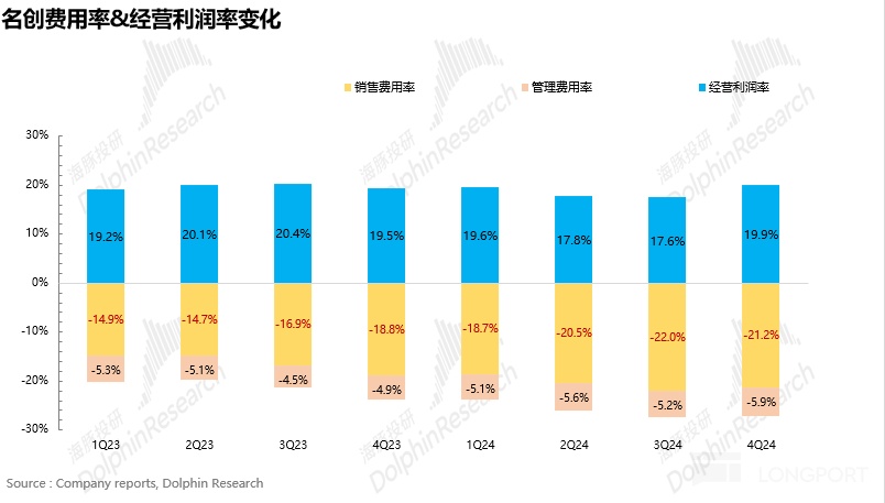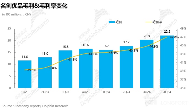 得益於 IP 零售戰略持續推進,IP 係列的高毛利産品佔比不斷提升、疊加海外直營門店加速拓店(相較於代理市場,直營門店毛利率高 20% 左右)、供應鏈成本持續優化、24Q4 名創毛利率進一步提升至 47%,創歷史新高。